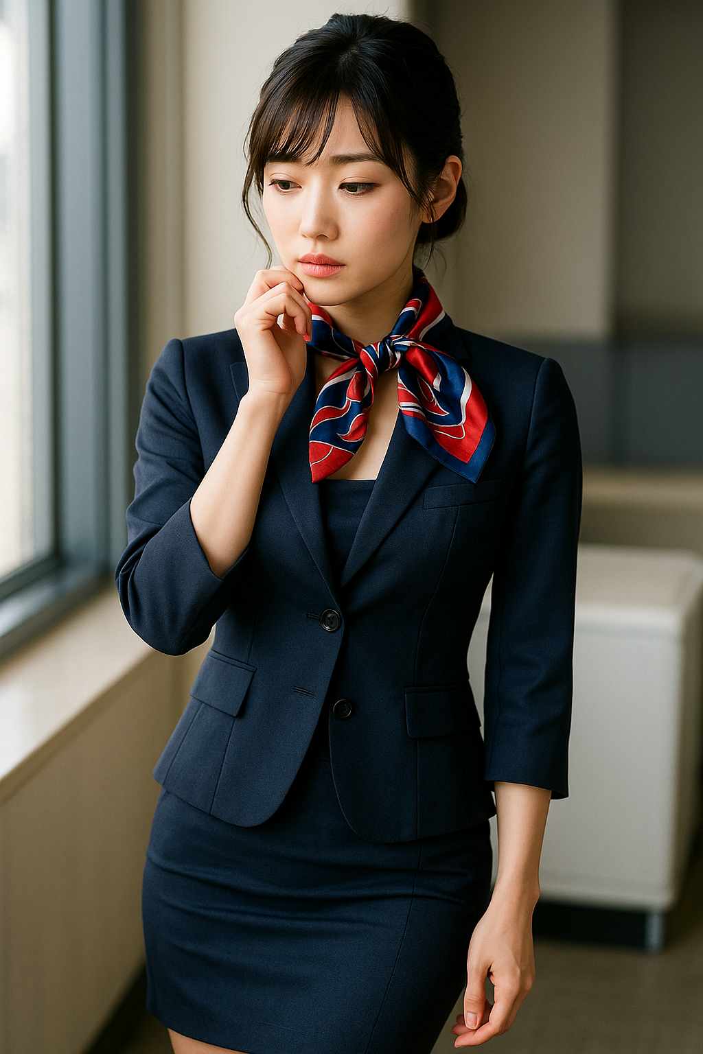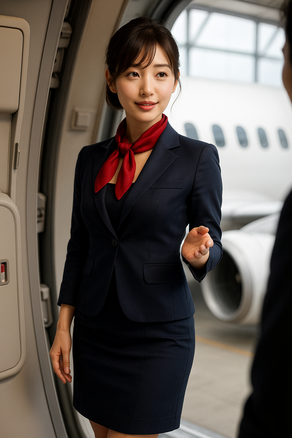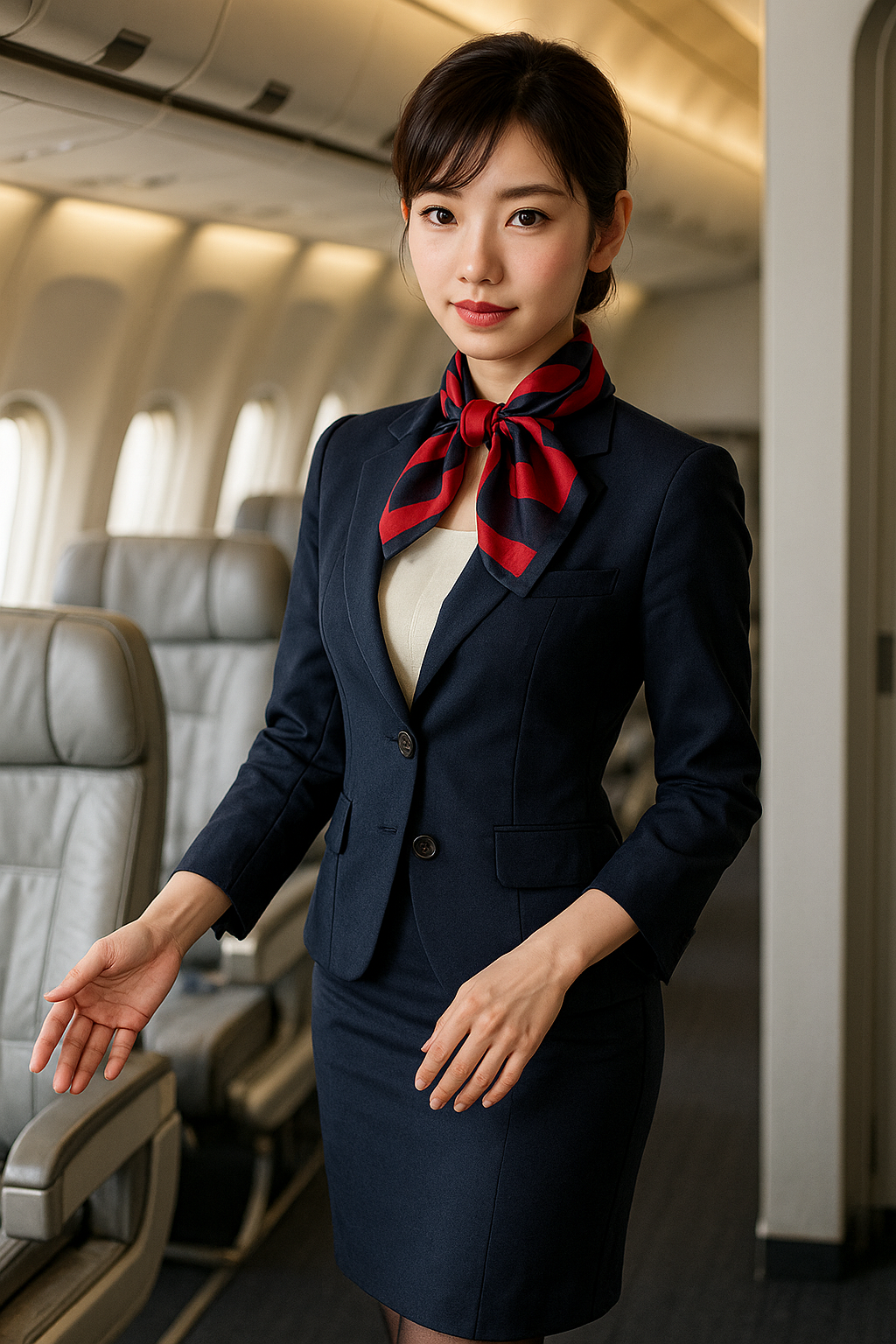 キャビンアテンダントには、現実世界でも洗練された印象があります。空のプロとしての知性、礼儀正しさ、そしてユニフォームが持つ「制約の美学」。このすべてが、AI画像の中ではさらに高い次元で再構築されます。たとえば、現実では実現が難しいほど完璧な着こなしや、絶妙なアイメイクとヘアスタイル、背景の演出までが、写真集1冊の中で違和感なく展開されていきます。
