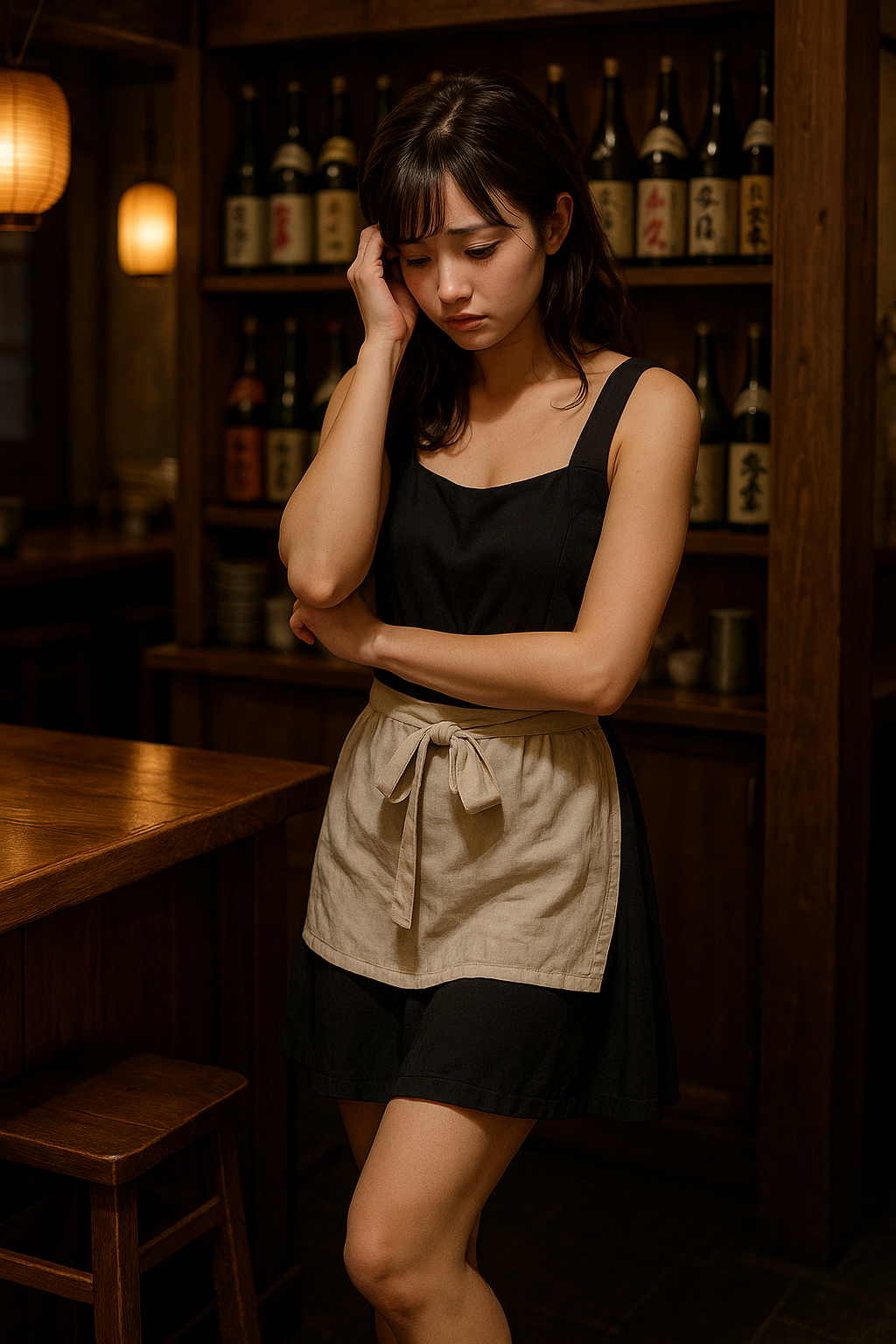 ・閉店後、カウンターでうつむく横顔